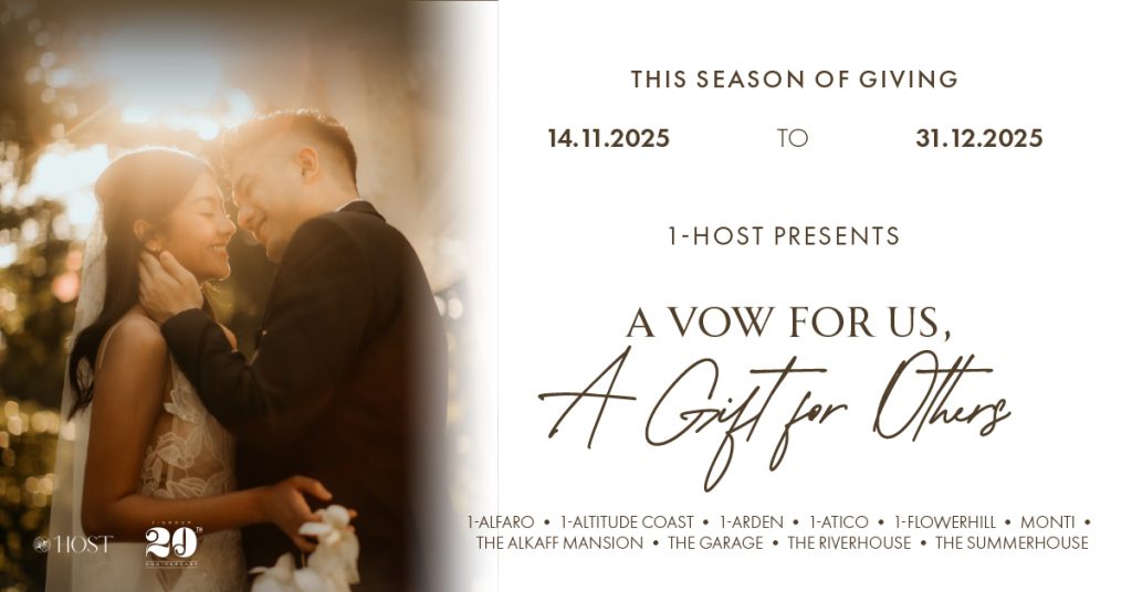 As we celebrate our 20th Anniversary, we invite you to share in a celebration of love in all its forms. Enjoy a special tasting of your wedding menu, as every celebration gives back to SPCA and Community Chest because love is even more meaningful when shared. This season, let your journey together inspire something bigger. Book your 2026/27 wedding by 31 Dec 2025 and enjoy exclusive perks across our 10 venues, our heartfelt thank you for letting us be part of your journey.