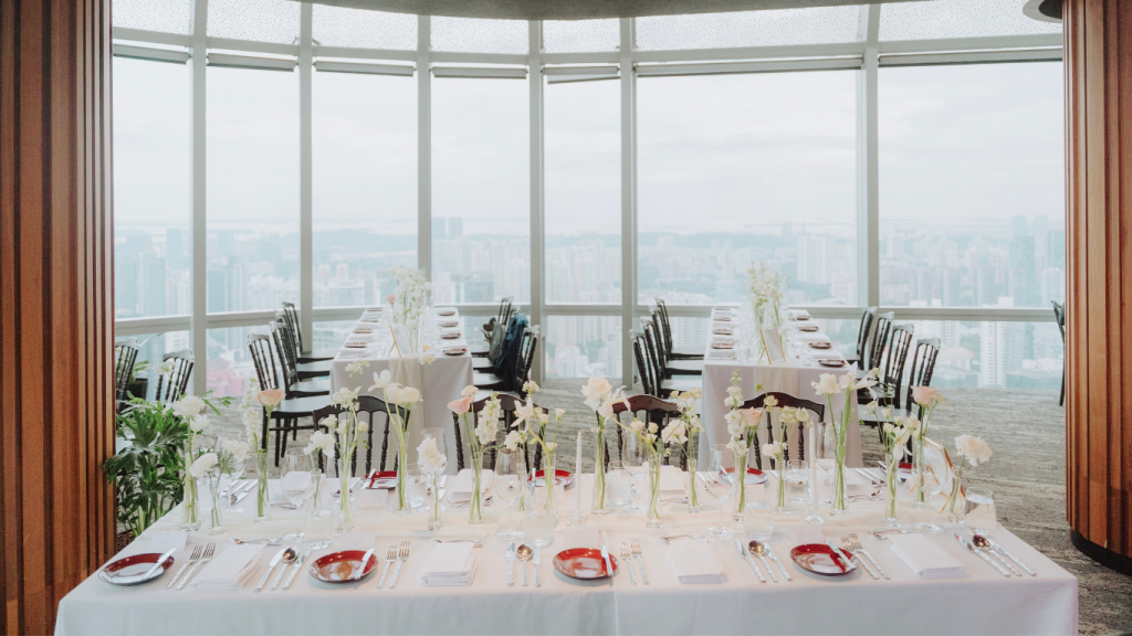 1-ATICO is a luxury wedding venue in Singapore located 55 storeys above ION Orchard, bringing together modern architecture, refined cuisine and panoramic city views in one polished setting. With its 360-degree skyline outlook, sky-high ceiling and floor-to-ceiling glass, it offers a contemporary indoor space that suits ROM ceremonies, solemnisations, intimate weddings and wedding dinners. Couples who want a city-view celebration will find a clean, elegant venue where the skyline shifts beautifully from day to night.